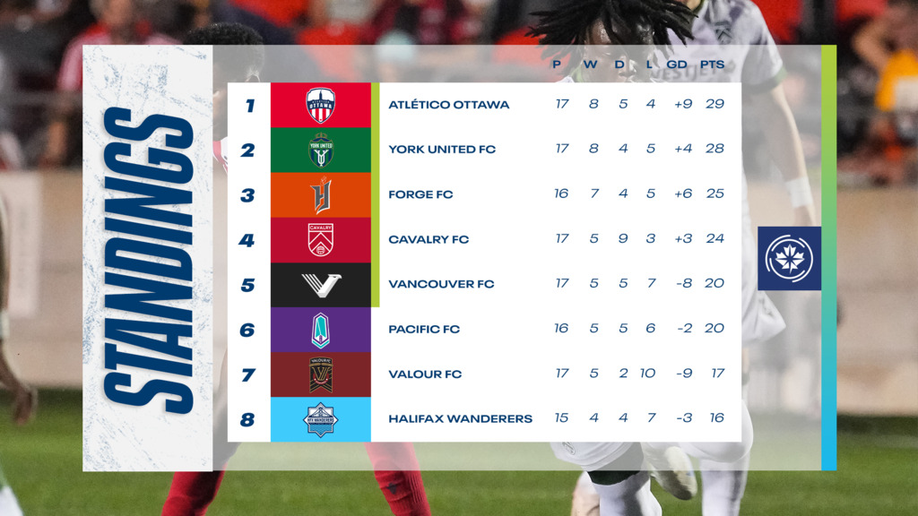 A four-day matchweek 17 in the Canadian Premier League gave us plenty to think about over the long weekend, as three out of four games featured a team beating an opponent above them in the standings. The result? A league table that’s tighter than ever, where the last-place Halifax Wanderers are just four points out of the playoffs, and only 13 off the top — which is the number of points Cavalry FC had over second place when they won the regular season last year. Those Wanderers made up some ground in front of a boisterous Natal Day holiday crowd on Monday, recovering from an early deficit to beat Vancouver FC 3-2. Halifax remain stuck in last place, though, because the day before that, Valour FC remained a thorn in Forge FC’s side, beating the Hamiltonians 2-1 in Winnipeg. On Saturday, league leaders Atlético Ottawa were toppled for the second game in a row, this time by Cavalry FC as second-half substitute Ali Musse returned from injury and scored both goals in a 2-1 win, the second being an 89th-minute screamer. The opening match of the weekend was Friday night’s affair out west, where Pacific FC and York United fought to a 1-1 draw on Vancouver Island with both goals coming in the first 10 minutes — including Brian Wright’s ninth of the season, putting him alone atop the Golden Boot race. Although the table hasn’t really moved this week, the numbers have: