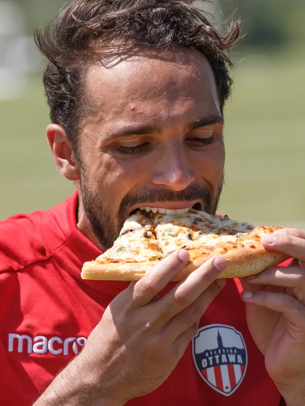 Atlético Ottawa’s fun pizza contest was taken on whole-heartedly (or whole-mouthedly) by ‘keeper Ricky Gomes.