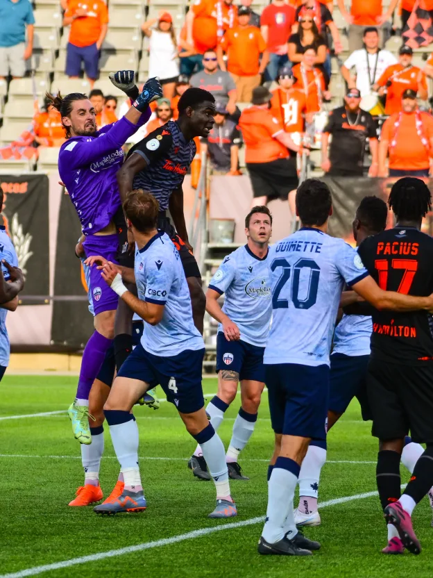The game’s scoring took absolutely no time to get started. OneSoccer commentator Adam Jenkins was unable to even introduce his commentary booth partner before Gabriel Antinoro gave Ottawa the lead less than 30 seconds in. After Forge defender Malik Owolabi-Belewu played the ball into touch in his own half, veteran Carl Haworth acted quickly. He sent a long, powerful throw into Antinoro’s feet, as the 19-year-old battled his way through two defenders before extending his right leg and elegantly finishing over a sprawled Triston Henry. The second-fastest goal in CPL history put the Hamilton crowd into shock as they were down 1-0 before they could get comfortable. Forge responded swiftly with a goal of their own to tie it… but not through their own play. Innocent ball movement around the Atlético backline went awry as defender MacDonald Niba sent a lengthy pass back to goalkeeper Nathan Ingham that got past him and rolled into an empty net to tie the game 1-1, just three minutes in. The crowd and commentary crew in disbelief at the start they had just witnessed, it wasn’t over yet.