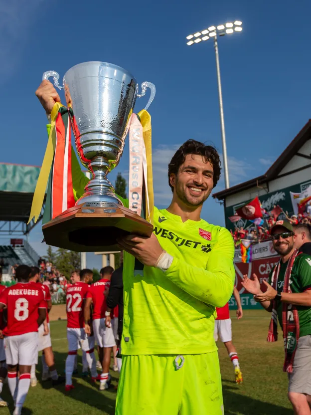 This past year, however, Carducci witnessed an even more important aspect of the club, its “family mentality”. During preseason, the 26-year-old was diagnosed with testicular cancer and had to undergo a radical inguinal orchiectomy. He says the club supported him through every step of what was an emotional and challenging journey. “They supported me from the minute I was diagnosed, to throughout my recovery and rehab and ultimately to this day” said Carducci, later adding, “the family and community mentality that we have at this club, not just within the club but with the fans and with the external community in this city, it is really special and I’m really honoured to be a part of it.” During the month of November, Carducci raised $3,690 for the Prostate Cancer Centre, supporting the same urologists that treated him. He continues to strive to raise awareness of the importance of early detection and seeking a doctor’s opinion if anything is out of the ordinary. After missing the first three matches of the season, Carducci would return to the field for the club’s 2022 home opener, on May 1, and kept a clean sheet in a 1-0 victory over Pacific FC. It would be one of a league-high (tied with Forge’s Triston Henry) 10 clean sheets he put up in 2020. His play would earn him this past season’s golden glove award — the only keeper in league history to win two. This year’s awards ceremony came as part of finals weekend in Ottawa, and Carducci stuck around for the final two days later. Having been in the league since the very start, he calls its growth “crazy” in the four seasons so far, especially considering two of them have come in the middle of the Covid-19 pandemic. “The growth we have seen is outstanding I think we have seen so many things just justifying why this league was developed and why it is so important to be here,” said Carducci. “You look at young players getting opportunities and moving on to bigger leagues. You have a guy like Joel Waterman, who played with us in 2019 who gets a call-up to the national team and is at the World Cup, among so many other things.” As a player who has now become one of the faces of the Canadian Premier League, his new deal will ensure he continues to contribute to that growth both on and off the field. For Cavalry, he will continue to be a key player both on the field, and more and more in the locker room as well. “It allows me to step into even more of a leadership role, which I am really excited to do, again being one of the few original guys who will be remaining on the team,” said Carducci. “I know what this club is top to bottom and I want to personify that.”