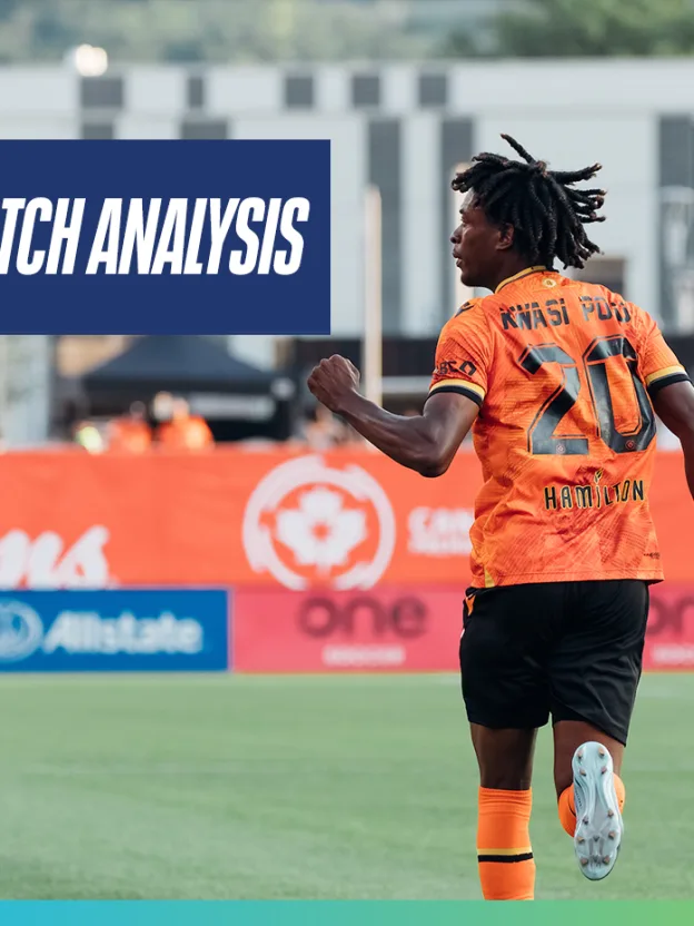 It is wild to think that just over a month ago Kwasi Poku scored his first league goal of the 2024 CPL season, in the second minute of stoppage time at the Wanderers Grounds back on June 15. On Saturday night in Hamilton, against that very same Halifax side, Poku scored his seventh and eighth goals of the CPL season, all of which have come in the past seven matches. His second goal on the night tied him with York United’s Brian Wright and Atlético Ottawa’s Rubén del Campo for the CPL Golden Boot lead. He also now has ten in all competitions as well, having found the back of the net twice in the Canadian Championship, and has a pair of assists. Since moving to striker in late May, the 21-year-old continues to put together one of the most impressive goalscoring runs the league has ever seen. His confidence appears to be increasing weekly, as does his grasp of the striker position. He opened the scoring on Saturday in just the 15th minute on a goal that while it may seem like another simple tap-in, but came as the result of clever attacking movement to find space in between the Halifax central defenders. The goal was an example of the key area where Poku has perhaps progressed the most since stepping into that position.