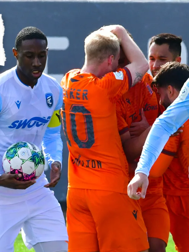 Down 2-0 at halftime, the Eddies came out of the interval clearly hoping they could find a goal quickly and give themselves a chance in the game. The 10 minutes after the break saw them press much higher than they had previously and switch play from side to side more frequently, with Tobias Warschewski doing a lot of good work to win duels and try to create. With that extra aggression from Edmonton, though, Forge knew they’d be able to find opportunities on the counter-attack. They had a few great opportunities late in the game, especially after Chris Nanco came on, and were it not for a couple of missed chances from Woobens Pacius they might’ve had four or five goals on the day. Smyrniotis identified another tactical tweak his side made in the second half so they could better hold their shape and pick their opportunities, as central midfielder Alexander Achinioti-Jönsson slotted between the centre-backs to make it a back three. “In the second half we changed things, where we dropped Jönsson a little bit further back, just to give us a little bit better structure on the ball and just draw Edmonton a little bit out,” Smyrniotis pointed out. “We knew they obviously had to come in and try to score some goals, and that was a way of trying to draw them a little bit further out and increase the space between the lines, which I think occurred.” With the early second-half energy from Edmonton not producing the goal — or even the shots — they wanted, though, Koch was forced to keep an eye on the future. The Eddies have a difficult week coming, with a midweek clash against Pacific FC at home on Wednesday followed by another road trip out to Halifax next weekend. Around the hour mark, Koch’s triple substitution was evidence of him planning ahead, and he admitted as much postgame — although he also wanted to hand some minutes to players like Wesley Timoteo and Mamadi Camara to see what they could provide in the late stages. “This is a killer week that we’re about to go on,” Koch offered. “Flying out to Ontario, flying home tomorrow and playing Pacific on Wednesday, and then flying to the maritimes — thanks, Mr. and Mrs. Schedule. A hundred percent, in the 60th-odd minute was definitely thinking about moving on to the next game.” He added, though: “I wanted to get more of a response from our group, not meaning get a result, but show some character at the end. Give some players that haven’t played much an opportunity to show what they could do.”