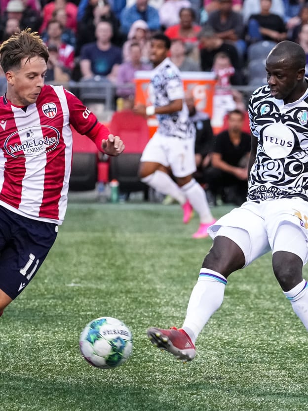 Atlético Ottawa and Pacific FC battled fiercely to a 1-1 draw at TD Place on Wednesday evening, as a first-half Steffen Yeates goal for Pacific was ultimately cancelled out by Maxim Tissot’s outstanding second-half free kick, as both sides took another small step forward in their bids to qualify for the playoffs. Looking to rebound from Friday’s frustrating draw at home, Pacific boss James Merriman opted to make just two changes to his team, bringing Kekuta Manneh into the attack and inserting Sean Young in midfield in place of the suspended Cédric Toussaint. The hosts Ottawa, meanwhile, made more significant changes, with both Samuel Salter and Malcolm Shaw returning up front while Noah Verhoeven slotted into midfield and Jean-Aniel Assi and Luke Singh joined the back five. As is often the case in matchups between these two sides, Pacific had a heavy possession advantage against an Atleti side forcing them to try and break down their block. It took Pacific a while, with not a lot of grade-A scoring opportunities presenting themselves in the first 20 minutes thanks to Ottawa’s well-organized defensive shape, but eventually the Tridents did find a way through. Just before the half-hour mark, Manneh slipped a dangerous ball from the right half-space to Yeates, who tapped it past Karl Ouimette and ran onto it himself, smashing a shot directly over the head of Ottawa ‘keeper Nathan Ingham and below the crossbar to make it 1-0 for the visitors. The match started to open up much more once Ottawa were trailing, and the final 15 minutes of the first half saw the hosts create four shots — two on target — with much more of the ball, as both sides began to play more direct and try to get the ball downfield quickly. Atleti did have a few good opportunities, including one that fell dangerously at the feet of Maxim Tissot, but they were nonetheless forced to go into halftime trailing. Seeking to address some gaps in midfield, Ottawa manager Carlos González made one change at the break, adding Ilias Iliadis in place of Verhoeven in the middle. The tide looked like it might be turning in the home side’s favour just over five minutes into the second frame, as some good early possession led to Tissot driving into the box and Kunle Dada-Luke making contact with him from behind. Referee Scott Bowman awarded the penalty, which Ollie Bassett stepped up to take, looking for his 12th goal of the season — but the attempt was saved by an excellent dive from Emil Gazdov, who also managed to corral the rebound and keep it 1-0. Chaos did ensue in the next few minutes as well, with Ottawa continuing to attack in search of their equalizer. They had one chance on the counter-attack that trickled toward the goal line, only for Sean Young to slide in and tap it away from goal. Moments later, an Atleti corner kick sailed over traffic and was also destined for the net, but Ayman Sellouf was on hand at the back post to head it away off the line and again deny Ottawa on the doorstep. Finally, 15 minutes into the second half, the hosts were rewarded for their efforts. They won a free kick about 25 yards out, and the left-footed Tissot stroked it perfectly over the wall and into the top right corner with emphasis to level the score at one apiece. Pacific manager James Merriman made four changes midway through the second half, two on either side of the Ottawa equalizer — he brought Georges Mukumbilwa and former Ottawa midfielder Zakaria Bahous on in the 64th minute, followed later by Djenairo Daniels and David Brazão to try and inject more life into his attack. Shortly after the latter changes, one of Pacific’s starters nearly put them back in front — Sellouf curled what looked like a perfectly-placed shot toward the top right corner, but Nathan Ingham stretched out and just got his fingertips on it to deflect it off the crossbar, making what could well go down as the best save of the season. Pacific were by far the aggressors in the last 10 minutes or so of the game, with Manneh in particular buzzing around Ottawa’s penalty area, but ultimately the hosts did very well to keep them out of the high-danger areas — and nearly scored with a counter-attack of their own with the game’s very last action — and the match wrapped up in a draw. With a point each, neither side gained much ground in the league table. Pacific moved back into sole possession of second place with a one-point edge over Forge, while Ottawa leapfrogged Halifax Wanderers back into fourth, level on 33 points but with one more win.