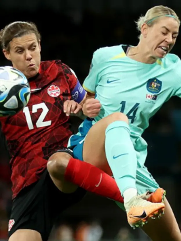 Catley and Rasa nearly combined for a second goal a few minutes later, as the Australian captain found her teammate in the box again, but Raso’s low shot was denied by an impressive, and important, diving stop from Sheridan. Canada were struggling to break out of their own half against a Matildas side that was pressing them really high up the pitch, and and when they were finding opportunities to get in behind, they weren’t taking advantage of them. There were a lot of sideways and backwards passes instead of moving up the pitch. Canada had three shots in the opening 45 minutes, but none of them on target, and their best scoring opportunity a header from Jordyn Huitema that went high and wide. Australia put the ball into the back of the net again in the 34th minute, as Mary Fowler fired the ball into the back of the net from close range after Canada failed to clear their lines. After a save from Sheridan, Kadeisha Buchanan was defending on the line, but Fowler fired the ball into the roof of the goal. The VAR got involved again, and this time ruled out the goal, saying that Ellie Carpenter was marginally offside as the ball was shot. That should have been a lifeline for Canada, but the Matildas were persistent, and ended up scoring a few minutes later to double the lead, and this time it counted. After a corner from Kyra Cooney-Cross was whipped into the penalty area, the ball fell to Raso a few yards out, and she made no mistake, putting the ball into the back of the net for her second goal of the game. Sheridan was unable to take control of her box, and none of the defenders cleared the ball away, allowing Australia to double their advantage.