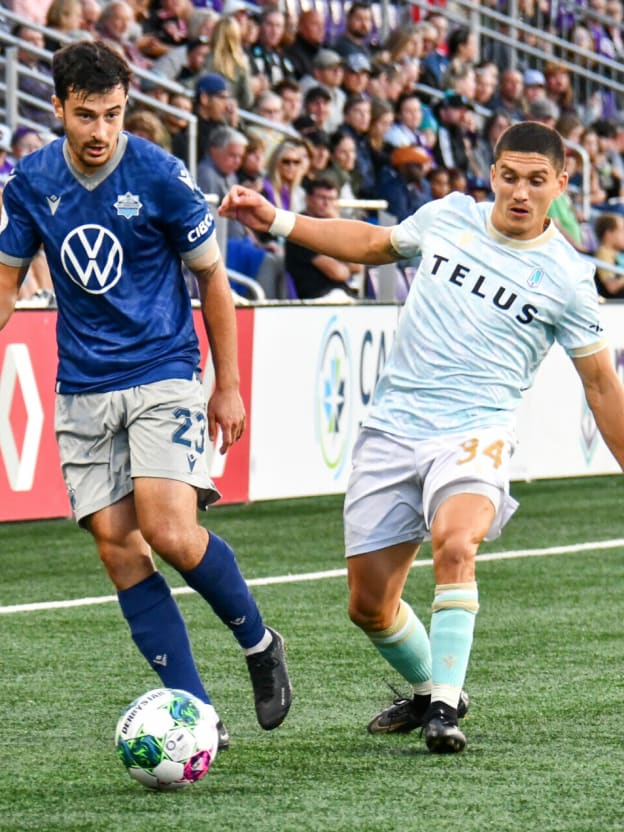 Pacific FC and Halifax Wanderers fought to a scrappy 1-1 draw at Starlight Stadium on Friday night, with the two sides from opposite coasts battling hard in a match where ultimately they could not be separated. Playing on a short turnaround from Monday’s game back in Halifax, the Wanderers rolled out a very different side, as Patrice Gheisar made nine changes from his previous lineup, giving Doneil Henry a second straight start and the captain’s armband while João Morelli, Lorenzo Callegari, Dan Nimick and several others sat out. Pacific, meanwhile, went with a similar squad to the one that beat Valour last Saturday, again deploying a back three — but with Amer Didic back in the mix this time. The early stages played out perhaps as expected, with the Tridents commanding possession in the first half. They created a few decent chances, including one that fell to the foot of Steffen Yeates, who had a good look at goal but put it over the bar. As the first half drew to a close, though, the Wanderers won a set-piece just outside the penalty area to the goalkeeper’s left. Aidan Daniels feathered a perfect cross into the box, reaching the head of youngster Armaan Wilson at the back post and Wilson headed in his first professional goal to give Halifax the lead at halftime. Pacific took some time to settle into the second half, but they again took control of the ball, and just 10 minutes into the half they found a way back in. Ayman Sellouf drove into the box and was tackled by Fumpa Mwandwe, whose foot made enough contact with the Pacific winger to prompt referee Alain Ruch to point to the spot. Sellouf stepped up to take the penalty himself and buried it to the keeper’s left, scoring in a second straight game and levelling the score at 1-1. About 10 minutes after that, Pacific coach James Merriman opted to turn to his bench first, bringing midfielder Sean Young and winger David Brazão into the game to replace Yeates and Adonijah Reid, respectively. Gheisar soon countered with Jordan Perruzza and Mohamed Omar coming off his bench, bringing off a pair of attackers in Tiago Coimbra and Théo Collomb. With about 10 minutes to play, the Wanderers were struck a blow of misfortune, as Mo Omar threw his arms in the air to ask for an offside call, which meant his hand was in the way of a cross into the box. Originally, the referee pointed to the spot, but upon consultation with his assistants he determined the handball had happened outside the penalty area — giving Pacific a free kick, which created a very dangerous chance in the six-yard box but didn’t get the Tridents their go-ahead goal. The final stages, including seven minutes of stoppage time, ultimately went by without incident, as both sides had an opportunity from a set-piece — plus the hosts had a handful of corners and some dangerous chances in the last two minutes — but neither side could find their way back to the net and the contest finished all square at 1-1. As a result, Pacific ended the night alone in second place, while the Wanderers moved into fourth with a point, as both sides now turn their focus to midweek games approaching rapidly.