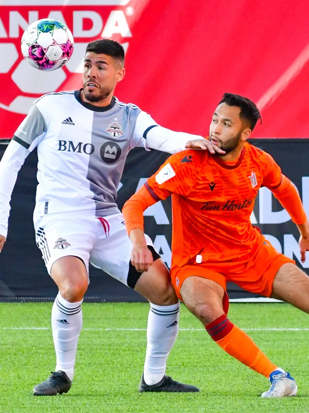 Toronto FC were crowned 2020 Canadian Champions on Saturday night at Tim Hortons Field, as they defeated Forge FC in a thrilling penalty shootout to claim the Voyageurs’ Cup after an intense match that ended 1-1 after 90 minutes. With a trophy on the line, both managers put their best possible lineup forward for this match. Although Forge gaffer Bobby Smyrniotis’ hand was forced somewhat by injuries to key defenders, he was still able to deploy a very attacking squad with Tristan Borges, Terran Campbell, and David Choinière across the front. Plus, former Toronto FC players Ashtone Morgan and Kyle Bekker got the start — Bekker playing in his fifth match against his old club, Morgan in his first. Toronto coach Bob Bradley, meanwhile, started a number of key stars, including designated players Alejandro Pozuelo and Carlos Salcedo, as well as veteran captain Michael Bradley. Forge surged out of the gates, pressing TFC aggressively and looking to play balls over the backline to create scoring opportunities — of which they had a handful in the opening 20 minutes, generating five shots. One early free kick attempt from Tristan Borges drew an excellent diving save from goalkeeper Quentin Westberg. In the 19th minute, Forge thought they’d found their moment; Choinière brought down a long ball superbly and drove toward the goal alone, prompting TFC fullback Luca Petrasso to bring him down from behind and concede an early penalty kick. Tristan Borges stepped up to take the spot kick, but his attempt thumped off the crossbar and out of harm’s way as Forge weren’t able to take the lead. After missing the penalty, Forge continued to press, but TFC also grew into the game somewhat and managed to penetrate into the attacking third far more often. Still, Forge’s Terran Campbell had perhaps the next best opportunity of the half with a powerful shot from just above the penalty spot, though Westberg once again parried it. Despite chances at both ends, though, the sides went into halftime knotted at 0-0. The visitors sought to add some energy in the second half, as Bob Bradley added Jacob Shaffelburg into the mix in place of Jayden Nelson. Almost immediately, TFC seemed to generate some momentum; they came perilously close to scoring just a couple of minutes into the half, but Malik Owolabi-Belewu managed to clear the ball just in time. Shortly before the hour mark, TFC at last broke through. After an initial attempt in transition was defended well, the ball cycled back to the top of the box where Alejandro Pozuelo was waiting. The Spanish star took a touch toward the middle and blasted it with his left foot into the top corner, just inches past the diving Triston Henry’s hand. Forge are not a team to lie down after conceding, though; just two minutes later, they surged back up the pitch. Aboubacar Sissoko, creating a pocket of space from the right touchline, spotted Tristan Borges running unmarked toward the back post, and he found him with an inch-perfect ball over the top. Borges brought it down well and fired with his left foot to equalize. From there, the game opened up incredibly. Both sides played very direct football, trying to get upfield as quickly as possible for the final half-hour. Terran Campbell and Woobens Pacius broke free of the TFC backline a few times to get on the end of long balls, but a few more excellent saves from Westberg kept it at 1-1. So, the game proceeded to a penalty shootout — just as it did the last time Forge faced an MLS team at Tim Hortons Field. The first two takers for both teams buried their efforts, but TFC’s third shooter — Deandre Kerr — put his shot well wide of the left post to give Forge an advantage. After Woobens Pacius and Alejandro Pozuelo both put away their attempts, though, Forge’s Kyle Bekker had his penalty saved to even up the shootout. Both sides scored four of their allotted five penalties, so the contest proceeded to sudden-death. Kosi Thompson scored his first strike, and Forge’s next — and final — taker Kwasi Poku put his shot off the crossbar, as Toronto FC claimed the trophy after a riveting final.