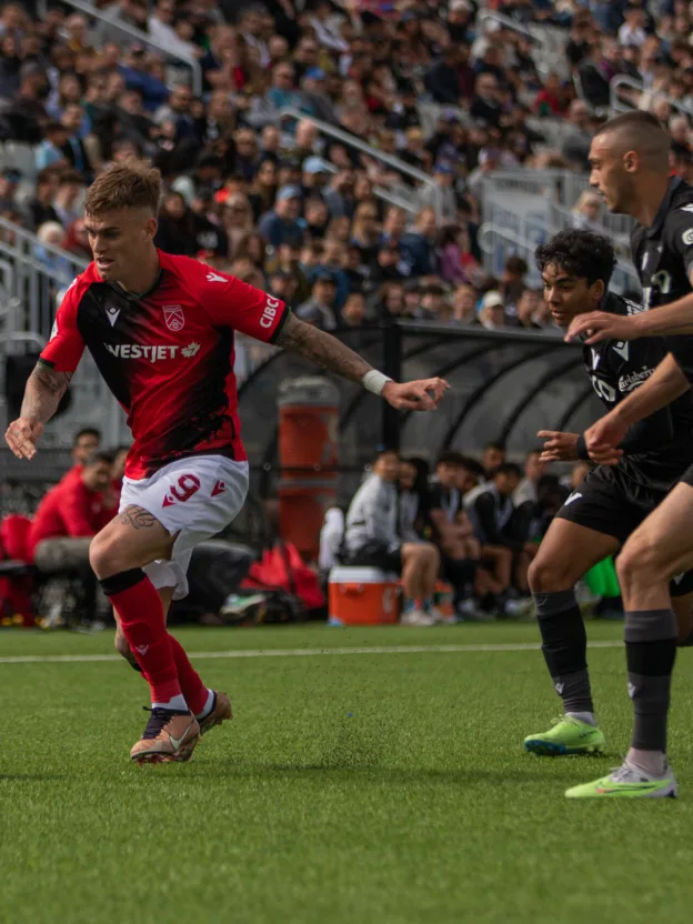 For the first time in club history, Vancouver FC welcomed fans to Willoughby Community Park on Sunday, as they hosted their first-ever home match against Cavalry FC. In front of a sold-out crowd, it was a special occasion for the club, as they continued their inaugural season with another big milestone. Yet, despite the grandeur of the occasion, Cavalry would do well to spoil the hosts’ party in the end, as the game finished 1-1, with both teams splitting second-half goals after a first-half red card from Vancouver. To begin the game, however, both teams came out strongly, fuelled by the energy of the crowd. After an early Jesse Daley chance saw the Cavalry midfielder send a shot well over the crossbar from outside of the box, Vancouver managed to win a free kick in a dangerous position in the 17th minute. There, they tried out an intricate set-piece routine, one that saw Gael Sandoval strike the ball with power, only finding himself denied by a commanding save by Marco Carducci. Continuing to grow into the game, Vancouver had another look at goal in the 20th minute, as Sandoval found Shaan Hundal with a looped cross, but Hundal’s header would be comfortably saved by Carducci. That momentum would soon be halted, however, as Vancouver’s Rocco Romeo would be given a straight red card following a collision with Myer Bevan in the 29th minute, leaving the home team to battle for the next 60 minutes down a player. Boosted by having the extra player, Cavalry nearly got on the board in the 34th minute, as Mikaël Cantave floated a dangerous cross towards Bevan, one that would float just over his head and straight onto the post, much to the relief of Callum Irving in goal. Then, in the 39th minute, Bevan managed to get into a dangerous area of the box after he was played in by Ali Musse, but he’d send his shot just over the goal from a tight angle. From there, however, that’d be all that the first half would have to offer, leaving both teams to recollect their thoughts as they headed to the locker room for the break. Turns out, Cavalry would benefit immensely from that, as they then came out of the gates flying in the second half. Thanks to that, they opened the scoring nearly immediately, as a loose ball fell to Cantave in the box, where he did well to slot the ball through Eugene Martínez’s legs and into the bottom corner for the first goal of the game. Yet, despite a goal that would’ve sunk most teams, Vancouver did well to hang in the game. As a result, they managed to tie the game up just minutes later. After a great ball from Gael Sandoval to Shaan Hundal, the striker did well to hold off his defender and slot home for his third of the CPL season, sending the crowd into a rapture of noise as they celebrated their first-ever home goal. Following the goal, however, Cavalry would do well to grab control of the play once again, as they pushed for another lead. Yet, they weren’t able to generate many shots to show for their efforts, as their next attempt didn’t come until the 70th minute, when Fraser Aird sent a half-volley just over the goal after a nice cross from Jose Escalanté. At the other end, Vancouver continued to get looks of their own despite being down a player, and nearly scored as a result of that in the 75th minute. There, Bitar unleashed a powerful shot from just outside the box, with his shot sailing just wide after a deflection by a Cavalry defender. Yet, after that push, Cavalry would get the best looks to end the match, as a strong Charlie Trafford header off of a corner deep into added time seemed goalbound, but Vancouver escaped danger as Irving made a fantastic diving stop to keep the game tied. Then, right after, Ethan Beckford had an even better look on a half-volley inside the box, but again Irving came up clutch with the big stop. As a result, from there, that allowed Vancouver to see the draw over the line, as both teams were left to share the spoils in the end.