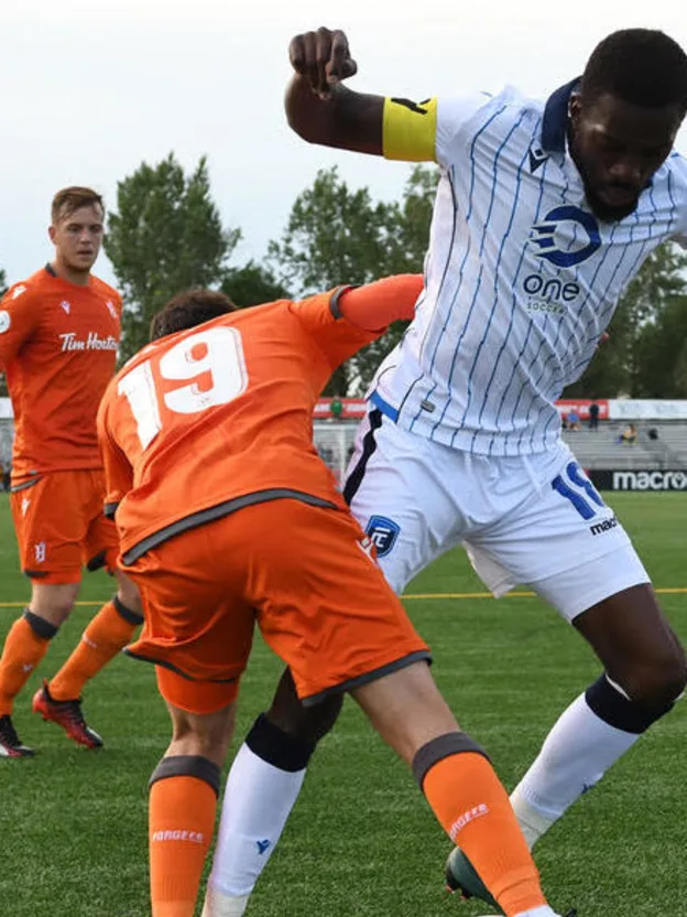 EDMONTON – During the thunderstorm that delayed the start of Wednesday’s game at Clarke Stadium by 20 minutes, Forge FC’s players and staff learned that Cavalry FC had clinched the Canadian Premier League spring title. Then, Forge went out and lost to FC Edmonton by a 1-0 to add insult to injury, the Eddies second win in a row. It was an Alberta double whammy for the men in orange. However, Forge FC coach Bobby Smyrniotis said that, while his team knew that Cavalry had just clinched the league, it didn’t affect his team’s performance. “I think we were already into our game preparations,” he said. “We talked about it with the guys beforehand and just prepared them and said we’re going into this game knowing what we have to do and not look at what happened in the other result. I think the guys obviously knew what happened there (at York) but they were still ready and prepared for the match.” And he lamented his team’s lack of finishing touch, especially in the first half. David Choiniere blasted over the bar from close range, and Kyle Bekker missed a wide-open goal. “We created a lot of opportunities and, on most days, we score a couple of goals,” said Smyrniotis. For the Eddies, Oumar Diouck’s 16th minute goal marked the first time the team has scored in league play on home turf. He poked a ball that looked to go right through Forge keeper Triston Henry, after a low cross from fullback Jeannot Esua. “We tried that in training with Jeannot,” said Diouck. “Sometimes in training, we centre, we put it in the box, one touch. Sometimes, in the box, you have a bit of luck.” The Eddies often overloaded the wings, having two players pressure Forge’s ball carries on the outside. Tristan Borges often had to try and steer through both Allan Zebie and his brother, Bruno. On the other side, Son Yongchan and Esua combined to harry the opposition. “If you go back to the first game we played them (a 2-0 Forge win at the end of May), and the damage Borges caused us getting the ball out wide and then cutting inside, he’s such a quality player, we know that about him,” said Paulus. “So that was the idea. And I’m so happy for both Bruno and Allan, because you get them out there and they both have this work-rate that is through the roof.” But, the best-laid plans of mice and men … Paulus was forced to make changes when centre back Amer Didic limped off in the first half, and then when Son had to leave with a bad foot after a yellow-card challenge from Forge defender Bertrand Owundi. James Marcelin, normally a mid, was inserted into the back for Didic, while six-foot-six centre forward Easton Ongaro was asked to finish the game as winger. Paulus praised both players for taking on the challenge of playing out of position. “To have players come in against a real quality side — I can’t understate how good Forge can be on the ball — but James Marcelin steps in at the back for his first minutes there this year. Easton Ongaro, who’s a striker, but his work-rate’s so good, he steps in and plays as a right outside mid. And they just stuck to the way we wanted to play, both of them. James was immense back there today. He controlled the back line.” Edmonton will look to make it three wins in a row on Canada Day as the team takes on HFX Wanderers FC at Clarke Field.