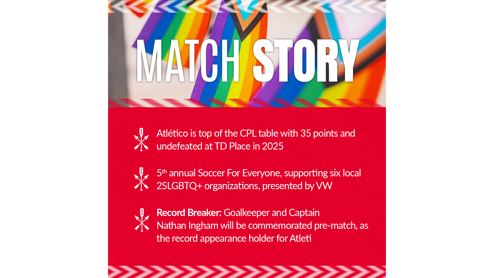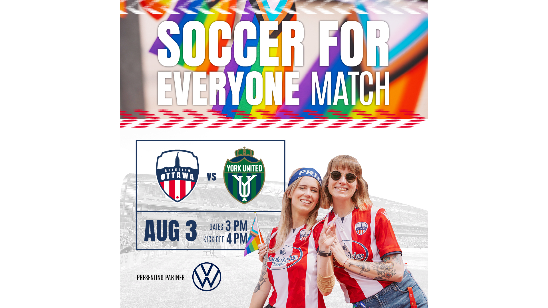 Atlético Ottawa leads the Canadian Premier League (CPL) standing, with the most goals scored in the league while continuing to prioritise the development of young Canadian talents. It’s the 5th Annual Soccer For Everyone Match, presented by VW, and we are supporting six local 2SLBTQ+ organizations who you can meet on the concourse.