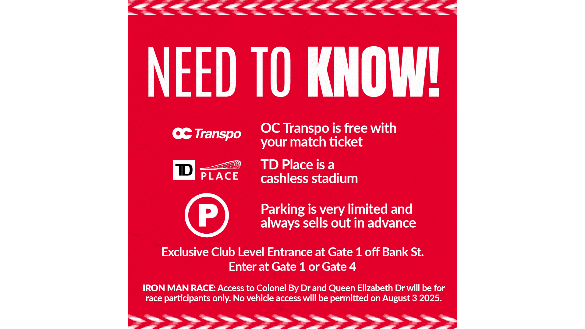 In town for the long weekend? Don’t miss a minute of the action and grab your tickets by CLICKING HEREand we will see you Sunday afternoon. For more information about the game and all the info you need before coming to TD Place, click any of the images below to launch the Match Day Guide.