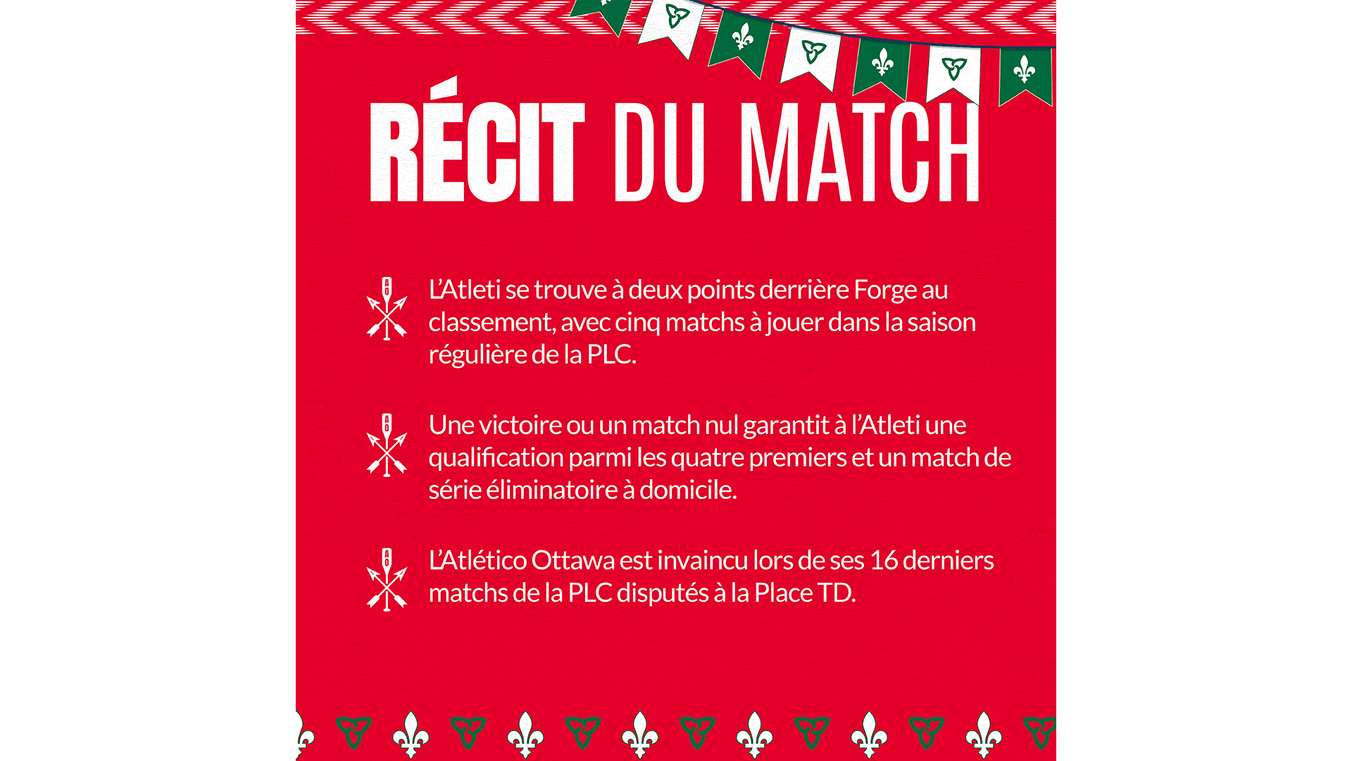 Atlético Ottawa faces a vital clash against league leaders Forge FC with the regular season reaching its finale. Sitting two points back from first, this match (KO 3PM ET, live on OneSoccer) has serious title implications. Atleti also celebrates its Franco-Ontarian match, working together with Ottawa’s francophone schoolboards, the Montfort Hospital foundation, and MuséoParc Vanier to cheer on Francophone culture in the city.