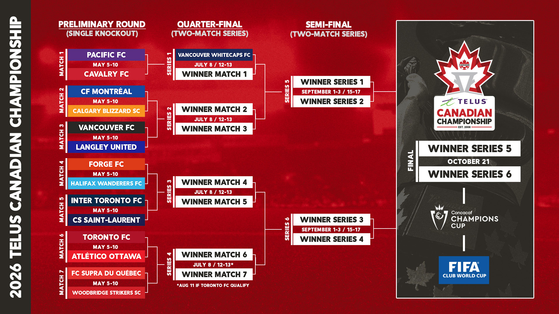 Canada Soccer’s TELUS Canadian Championship, also known as the Battle of the North, is the nation’s highest men’s domestic competition featuring clubs from coast to coast across the country, notably professional teams in Major League Soccer and the Canadian Premier League as well a representative in League1 BC, League1 Ontario and Ligue1 Québec. Winners of the 2025 TELUS Canadian Championship lift the Voyageurs Cup and qualify to the annual international competition, Concacaf Champions Cup. Winners of the CONCACAF Champions Cup qualify for the FIFA Club World Cup.
