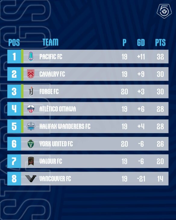Valour FC kept themselves alive in the race with their dramatic comeback win over Cavalry FC on Friday night, but they didn’t get any favours from the rest of the league. An emphatic victory for Halifax Wanderers over Vancouver FC on Saturday put them briefly into fourth place, only for Atlético Ottawa to take it back on Sunday with their win at Pacific FC. Forge FC and York United also both stayed in the mix, but shared points from a feisty 3-3 draw mean both sides were somewhat stagnant; Forge remain two points back of the top but technically in third (on goal differential), while the Nine Stripes are, currently, the odd ones out in sixth place, two points behind the final playoff spot. Don’t forget: with this year’s new five-team playoff format, every single position in the top five comes with different benefits, and a slightly different path to the CPL Final. Only the top four will host matches, and only the top two will have the luxury of a second chance to qualify for the Final after their first direct qualification match. Also, whoever finishes the regular season (on Oct. 7) atop the table will, of course, be recognized as the CPL’s regular season champions, and will receive one of the league’s two entries into next year’s Concacaf Champions Cup. Atlético Ottawa won the crown in 2022; who will it be this time?