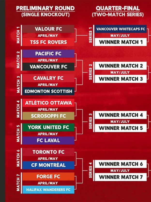 All Canadian Premier League Teams (8): Pacific FC (Victoria, BC), Vancouver FC (Langley, BC), Cavalry FC (Calgary, AB), Valour FC (Winnipeg, MB), Forge FC (Hamilton, ON), York United (Toronto, ON), Atletico Ottawa (Ottawa, ON), Halifax Wanderers (Halifax, NS)