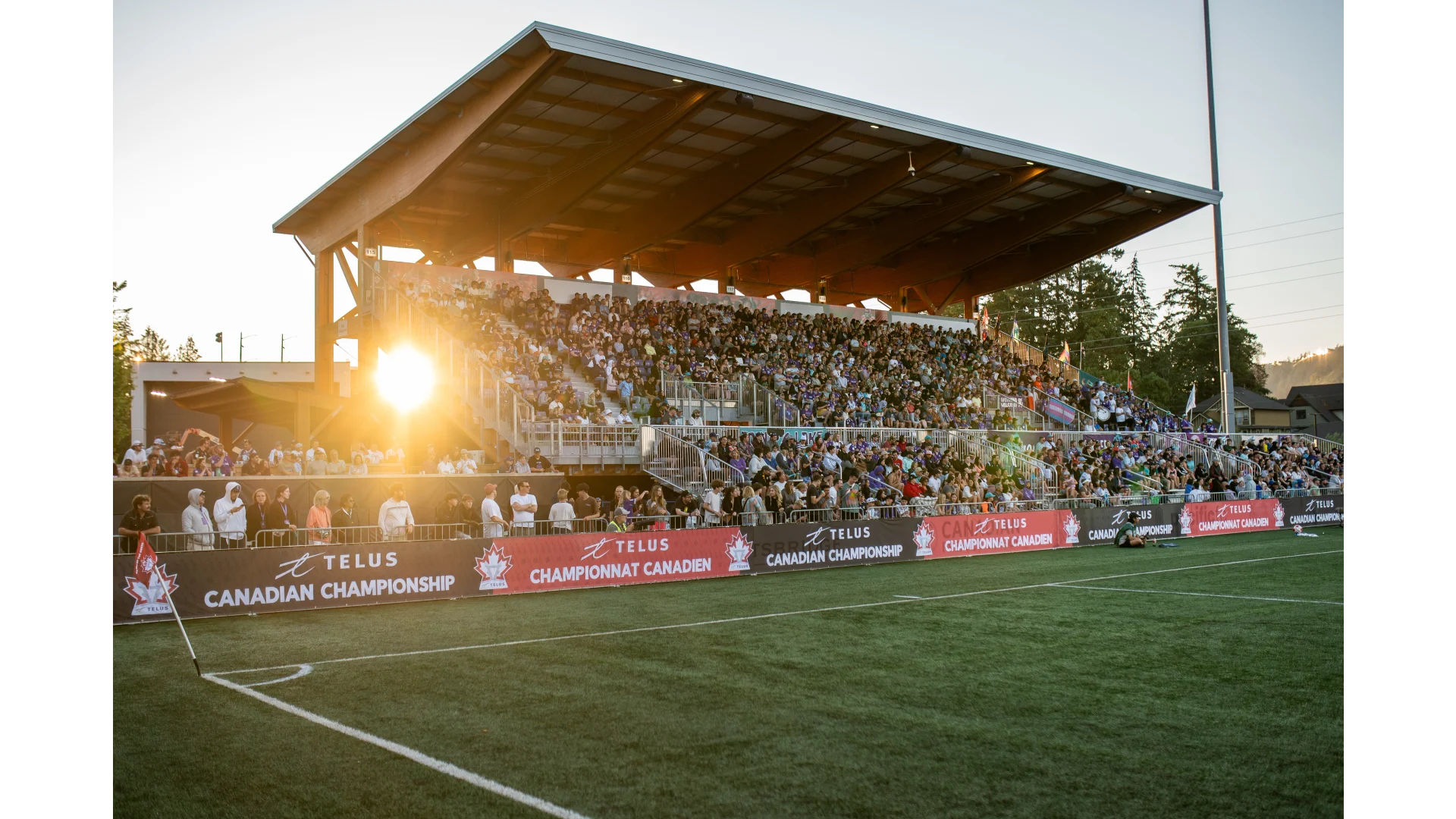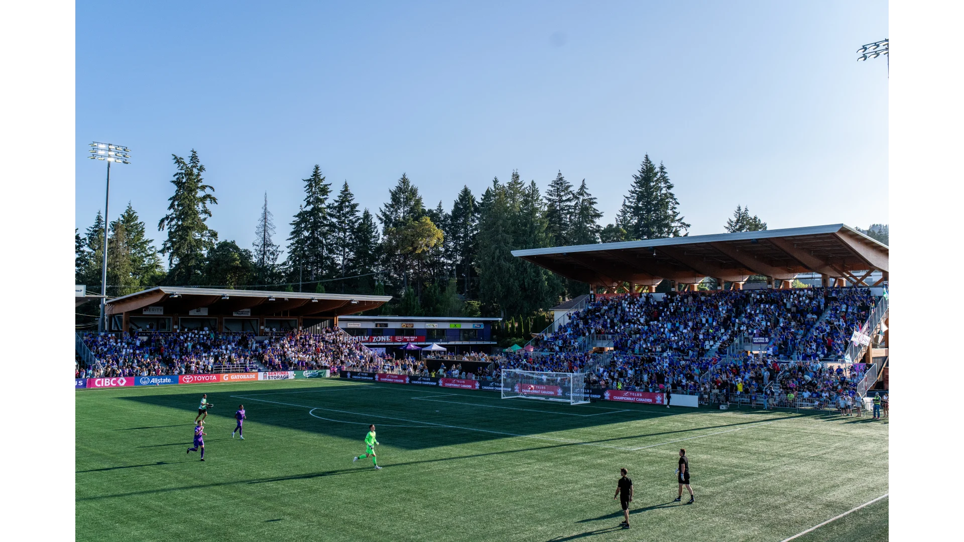 Our intimate stadium is designed to bring fans closer to the action, with seating that creates a direct connection to the pitch, making every match an electrifying experience. Towering Douglas fir trees surround the venue, providing a stunning natural backdrop that sets it apart as one of the most picturesque soccer destinations in Canada. The beauty of Vancouver Island enhances the stadium's charm, creating an atmosphere that blends the thrill of the game with the serenity of nature.