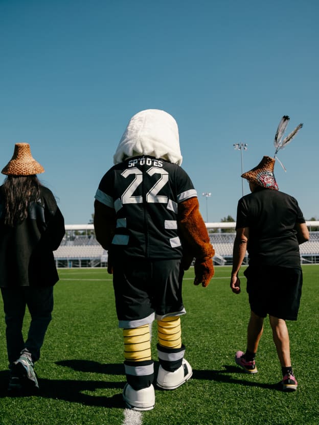 Vancouver FC is excited to share that the official name of their eagle mascot is Sp’óq’es (sp-aa-KUS). The name Sp’óq’es was gifted to the mascot by the q̓ʷɑ:n̓ƛ̓ən̓ (Kwantlen) First Nation which means “eagle” in Halq’eméylem, the language spoken by people of the Kwantlen, Katzie, Tsawwassen, Kwikwetlem, and Musqueam First Nations. The Vancouver Football Club was honoured and gifted with the traditional name Sp’óq’es, from the Kwantlen Nation. Kevin Kelly and Michael Kelly-Gabriel, husband and son (respectively) of Kwantlen Hereditary Chief, Marilyn Gabriel, shared Kwantlen Teachings and Protocols about the Sp’óq’es outside the gates of VFC’s home stadium, Willoughby Community Park. The eagle holds significant importance to Indigenous communities, including the Kwantlen First Nation. It was through listening to the teachings that Kelly had shared during the honouring that Vancouver FC learned about the Eagle Spirit. “When I see an eagle, it’s a good feeling. It looks after you, it protects you. It helps you when you’re not feeling good, it lifts you up, it warms your heart up,” explains Kelly. Kelly-Gabriel continues, “The eagle represents being the messenger to the Kwantlen Nation. As the eagle is the one who flies closest to our creator.“