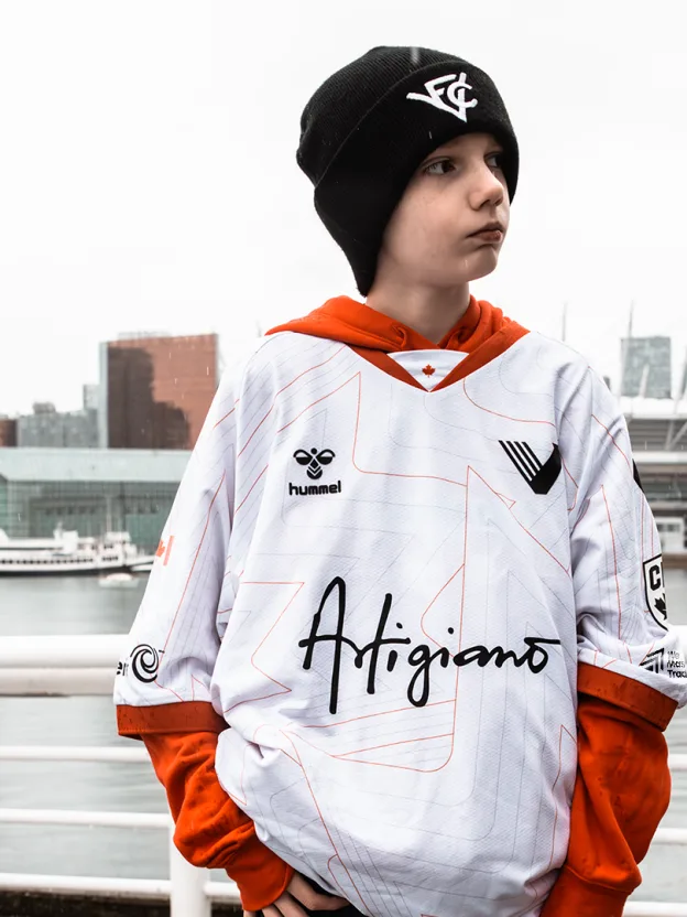 Bold red trims ground the design in Canada’s identity, while a dynamic maple leaf pattern bursts outward across the jersey, symbolizing the growth of the game radiating from Vancouver to the world. Subtle yet powerful, the detailing honours the city’s deep connection to Canadian soccer history while embracing what lies ahead.